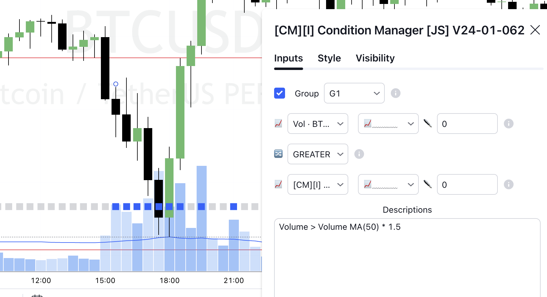 For example, if you need to check if the trading volume (Volume) is greater than the moving average (MA) value by 50% (1.5 times), you first use the DATA SOURCE module to calculate 1.5 * MA(50). Then you use the resulting value in CONDITION MANAGER as one of the external input data in RULE to compare with the trading volume. This helps you precisely adjust the conditions for your trading strategy.