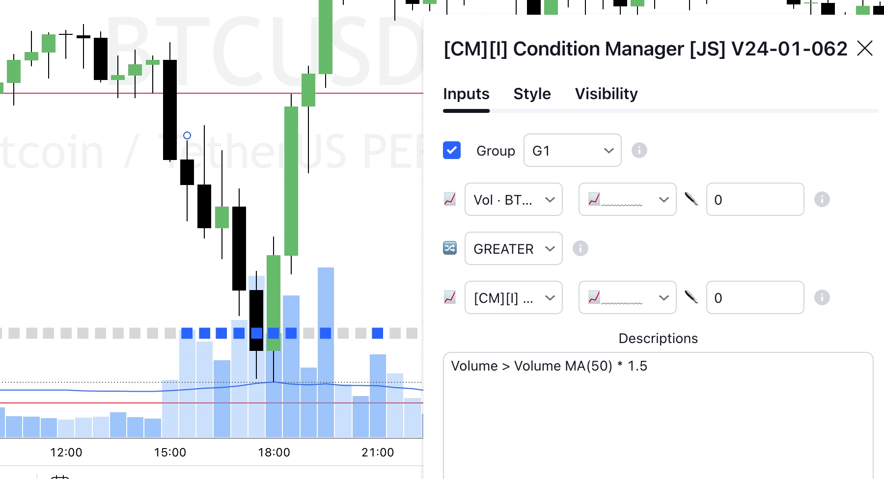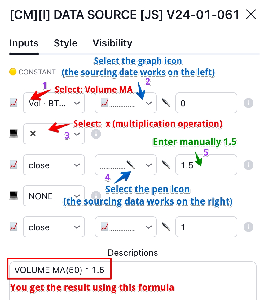 Например, если вам нужно проверить, больше ли объем торгов (Volume) среднего значения (Moving Average, MA) на 50% (1.5 раза), то сначала вы используете модуль DATA SOURCE, чтобы рассчитать 1.5 * MA(50). Затем полученный результат вы используете в CONDITION MANAGER как одно из внешних входных данных в RULE для сравнения с объемом торгов. Это помогает вам точно настроить условия для вашей торговой стратегии.