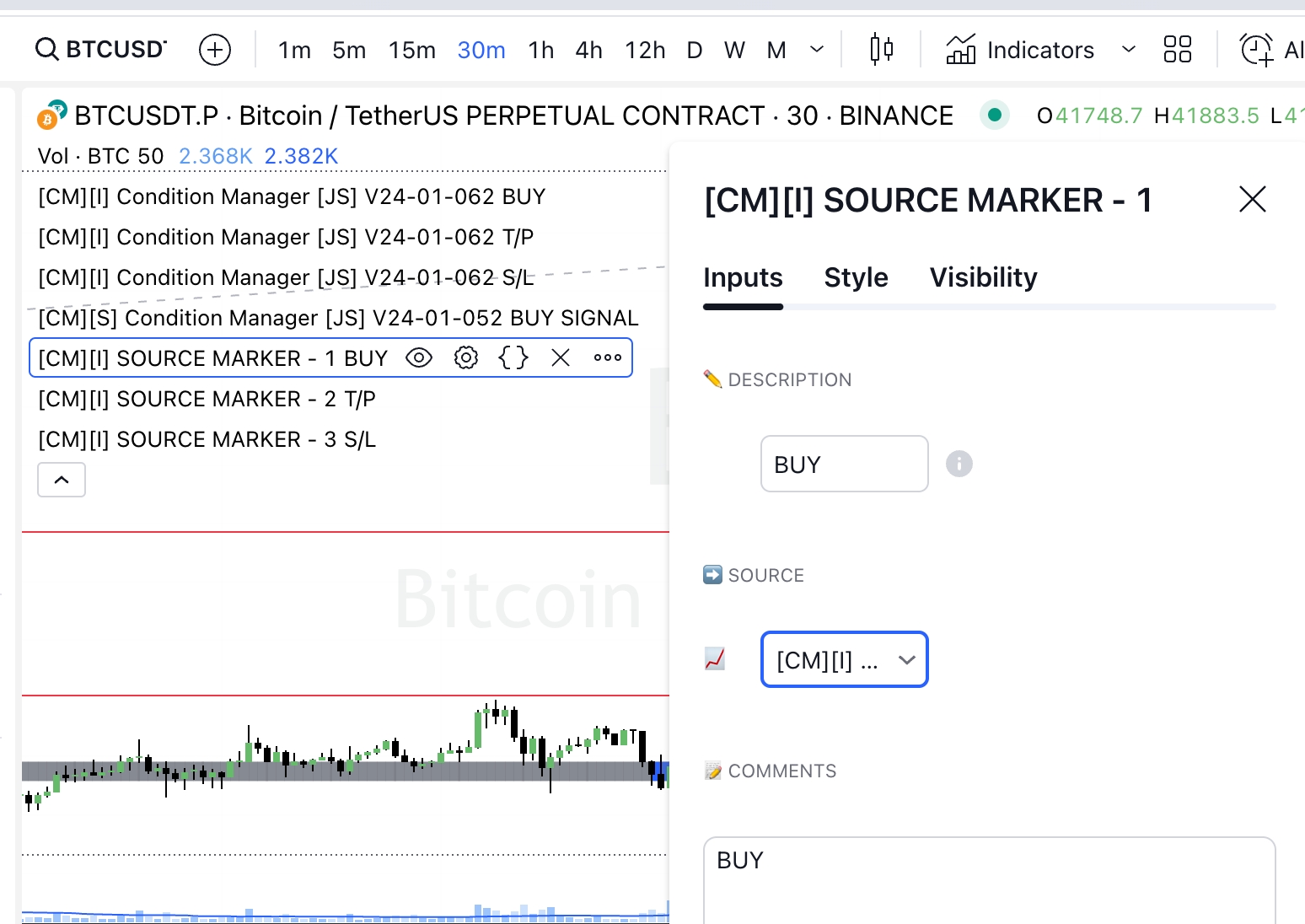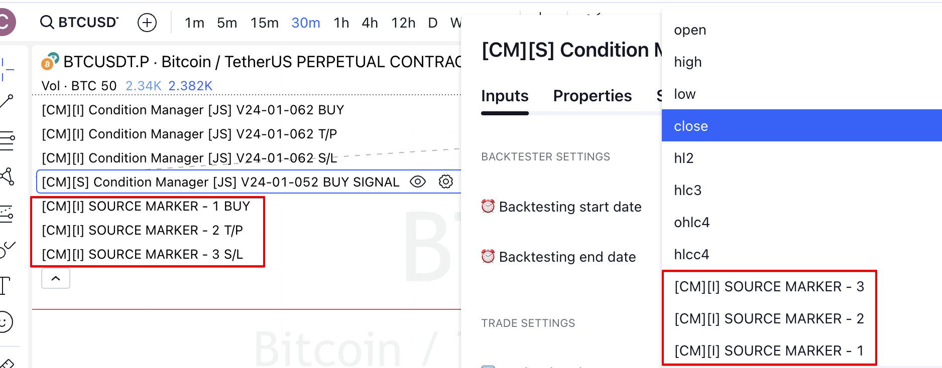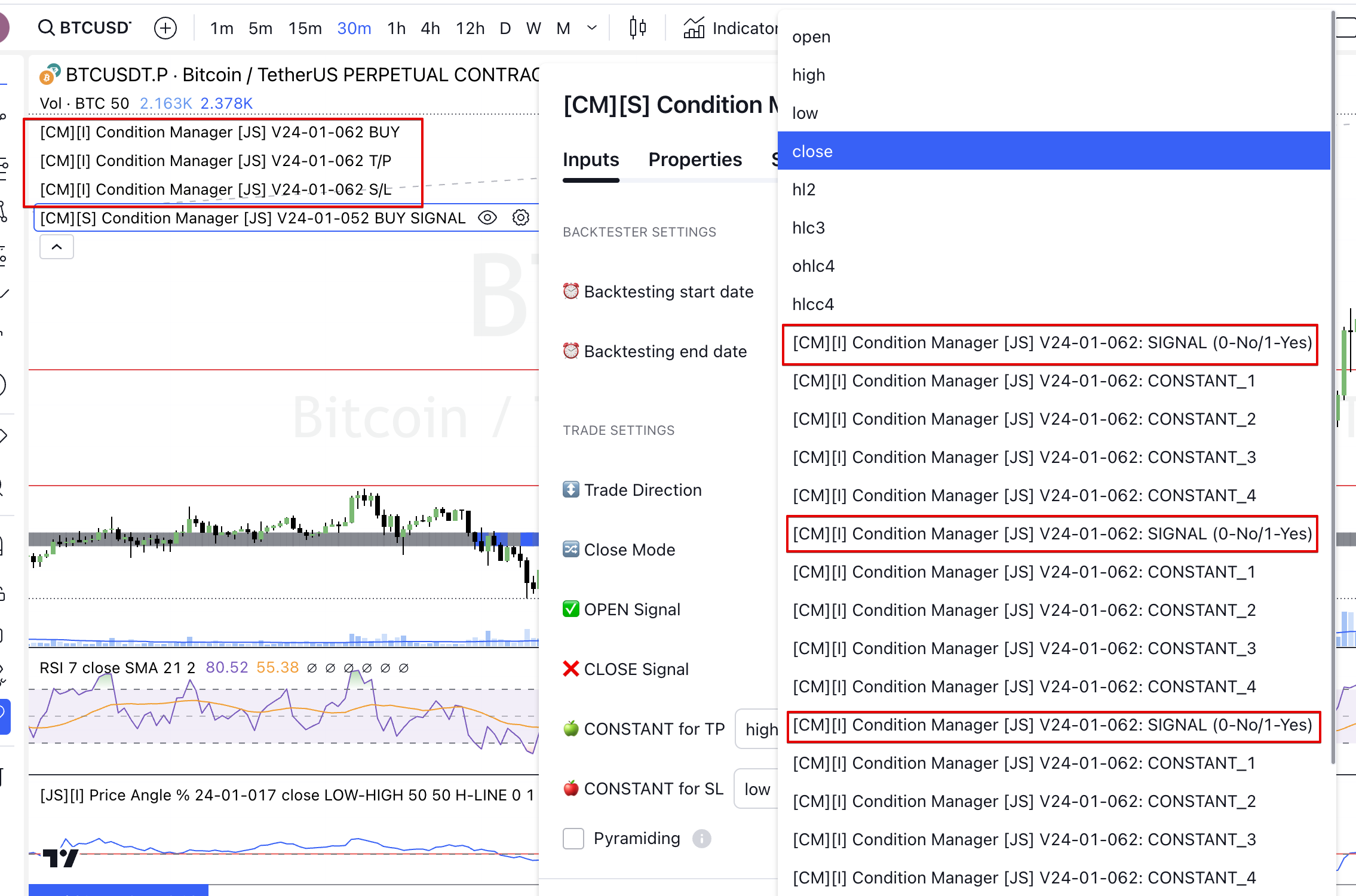 На графике есть 3 индикатора CONDITION MANAGER, которые выполняют различные функции и используются для различных сигналов в стратегию: Buy/Take-Profit/Stop-Loss. При выборе сигнала в стратегии определить какой из них для чего сложно.