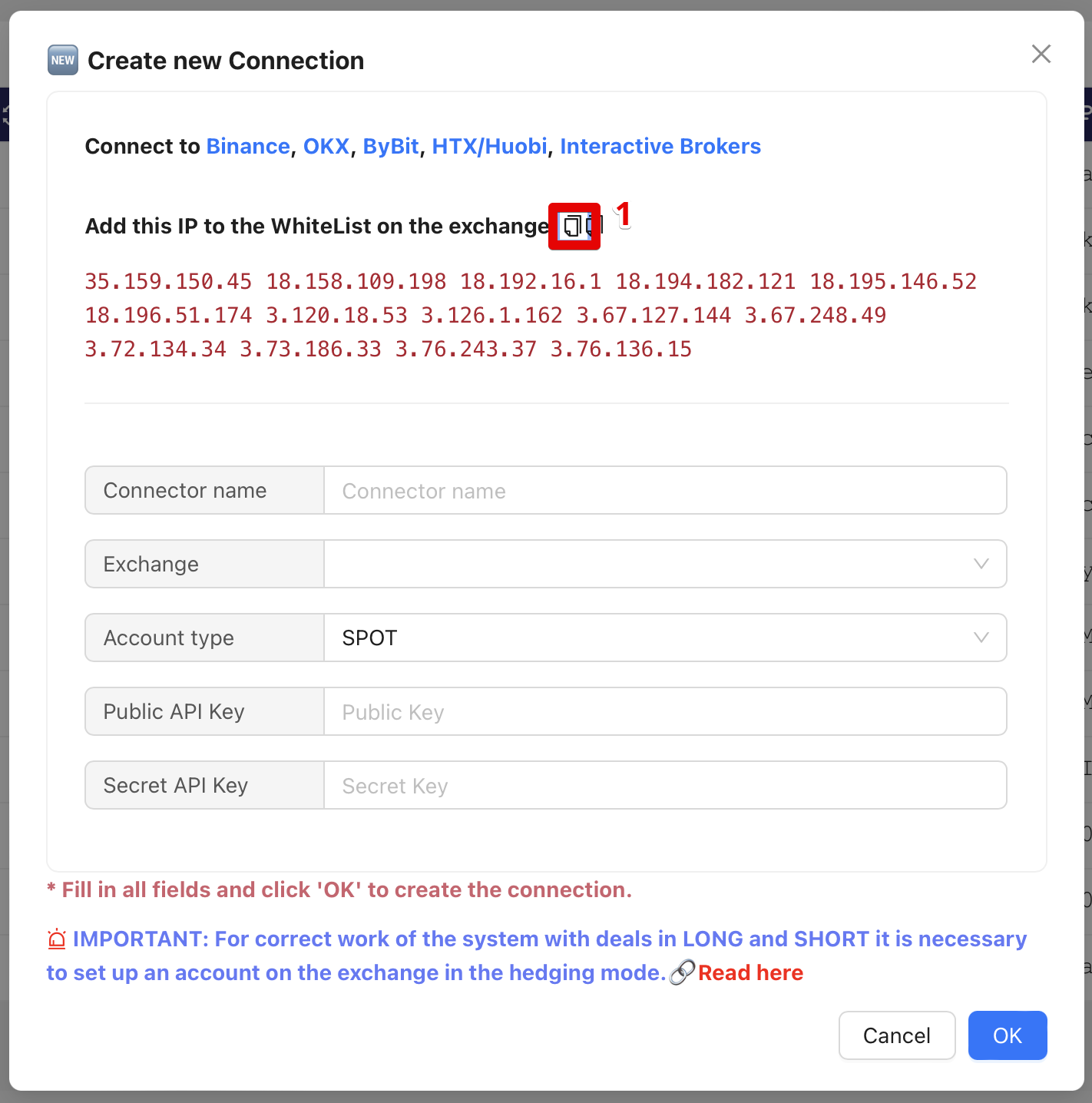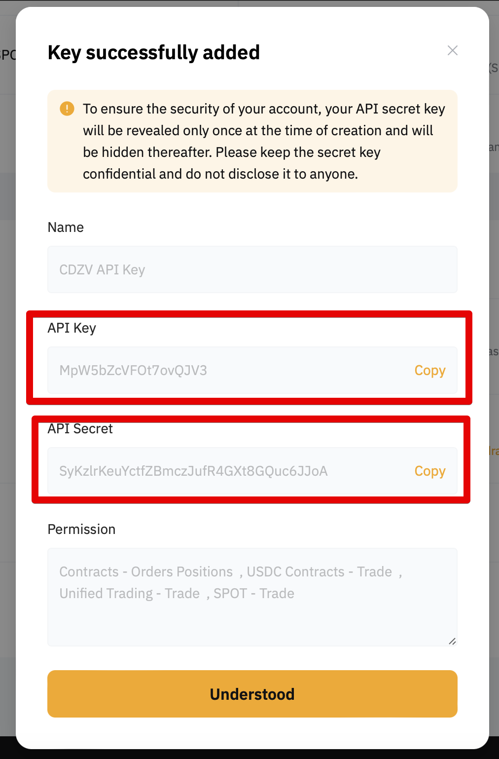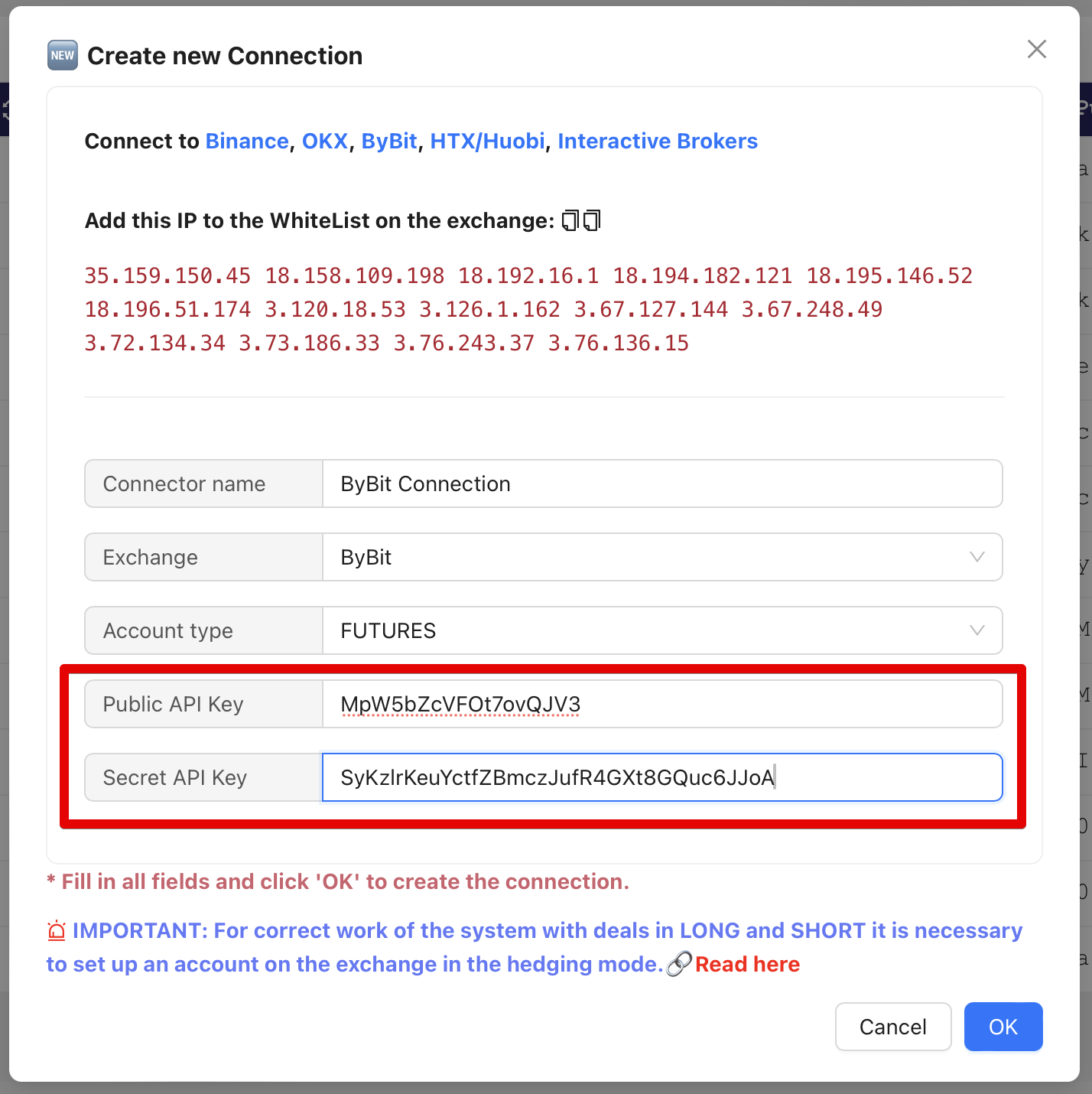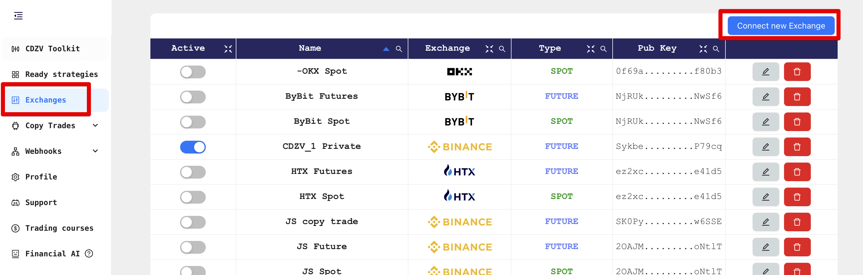 9. Создайте новое соединение с биржей в панели пользователя сервиса CDZV и введите ранее сохраненные Public и Secret ключи в панели пользователя сервиса CDZV. После нажатия кнопки «OK» система проверит подключение к бирже и, в случае успеха, создаст соединение.